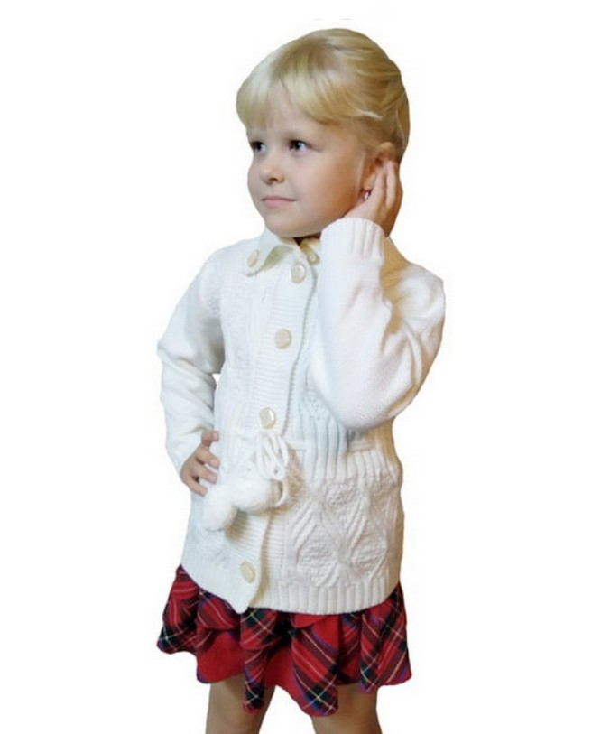 Очаровательный детский джемпер для девочки, ажурная вязка, на пуговицах с воротничком. Украшен пояском с помпонами