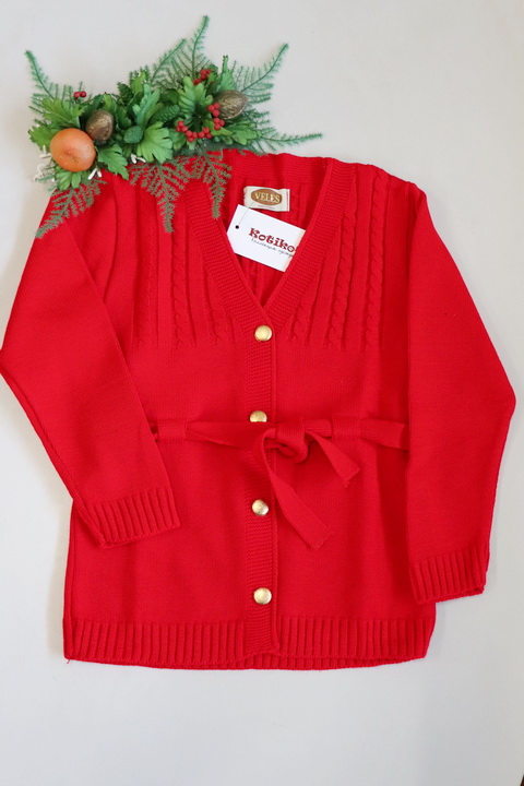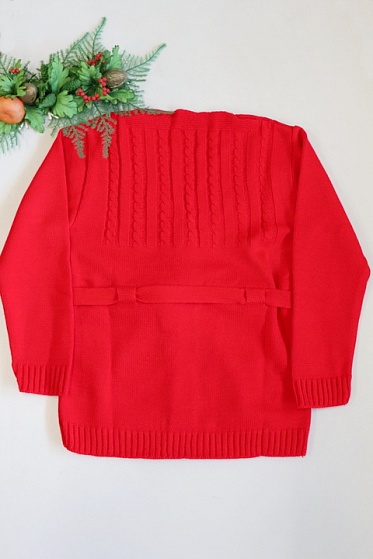 Джемпер для девочки школьного возраста на пуговичках. На кокетке выполнен узор из косичек, с кушаком