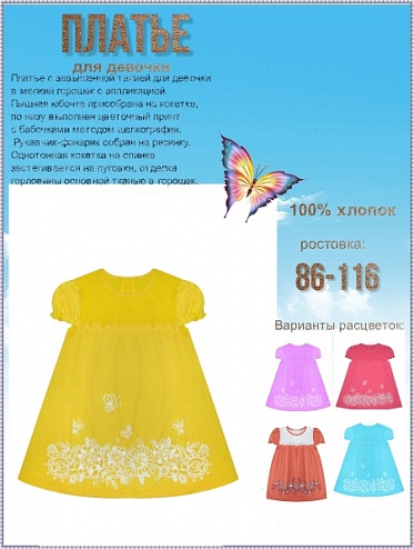 Платье  с завышенной талией для девочки в мелкий горошек с аппликацией. Пышная юбочка присобрана на кокетке, по низу выполнен цветочный принт с бабочками методом шелкографии. Рукавчик-фонарик собран на резинку. Однотонная кокетка на спинке застегивается на пуговки, отделка горловины основной тканью в горошек. Отлично выполненная модель для маленькой модницы.
