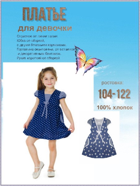 Отрезное по линии талии. Юбка со сборкой,  двумя боковыми карманами. Горловина окантована, со вставкой и декоративным бантиком. Рукав короткий со сборкой.Выполнено из натурального хлопка,симпатичная расцветка в морском стиле принесет радость её обладательнице.
